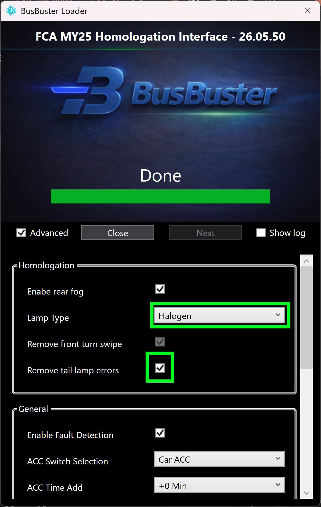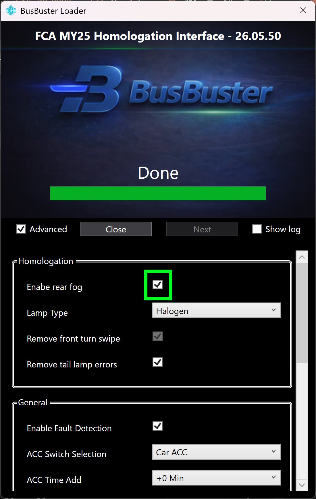 - Optionally also enable “Enable rear fog” to enable rear fog on the OEM light switch if the car does not have this yet.